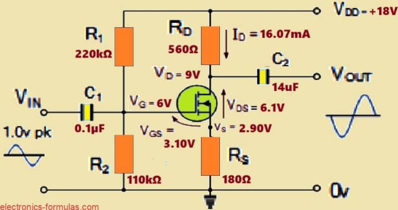 From the above calculated parts value we can now draw the finalized Single Stage MOSFET Amplifier circuit diagram as given below:
